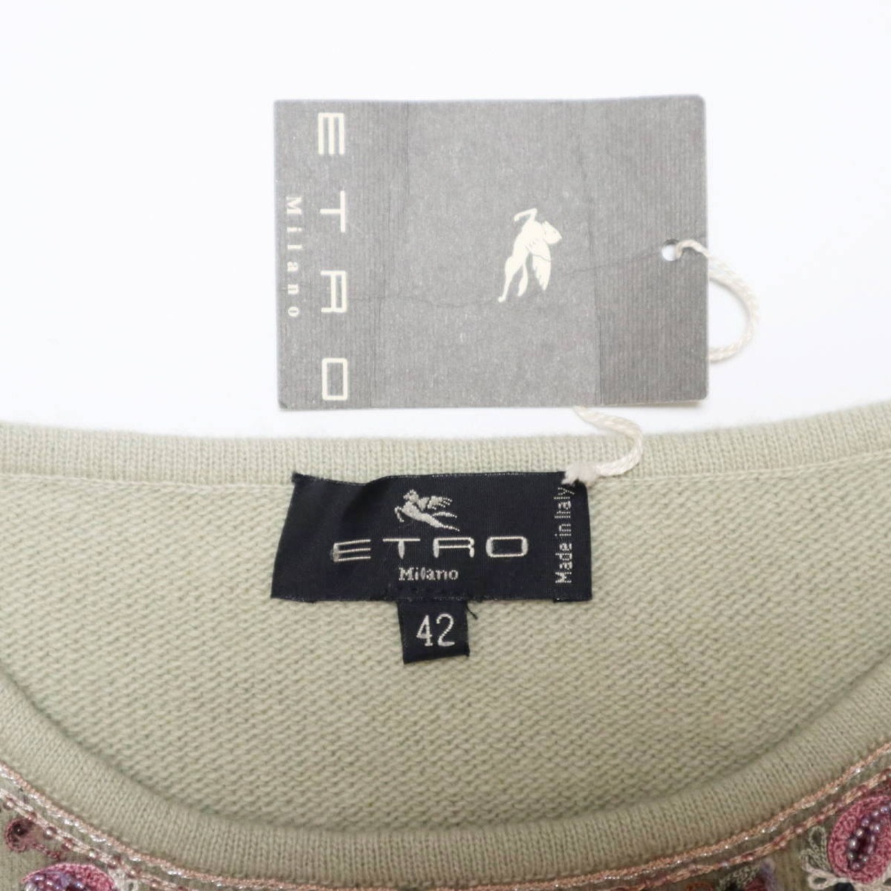商品名:ETRO エトロ ビーズ/スパンコール/刺繍 ウール/アンゴラ 長袖 二ット セーター 42 ライトグリーン/マルチカラー T2511-k075