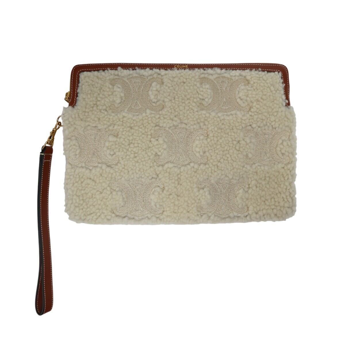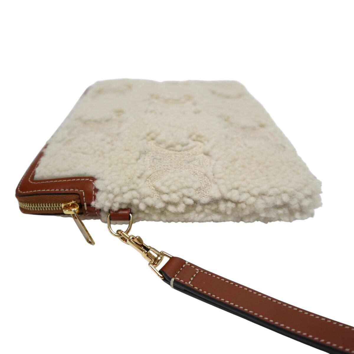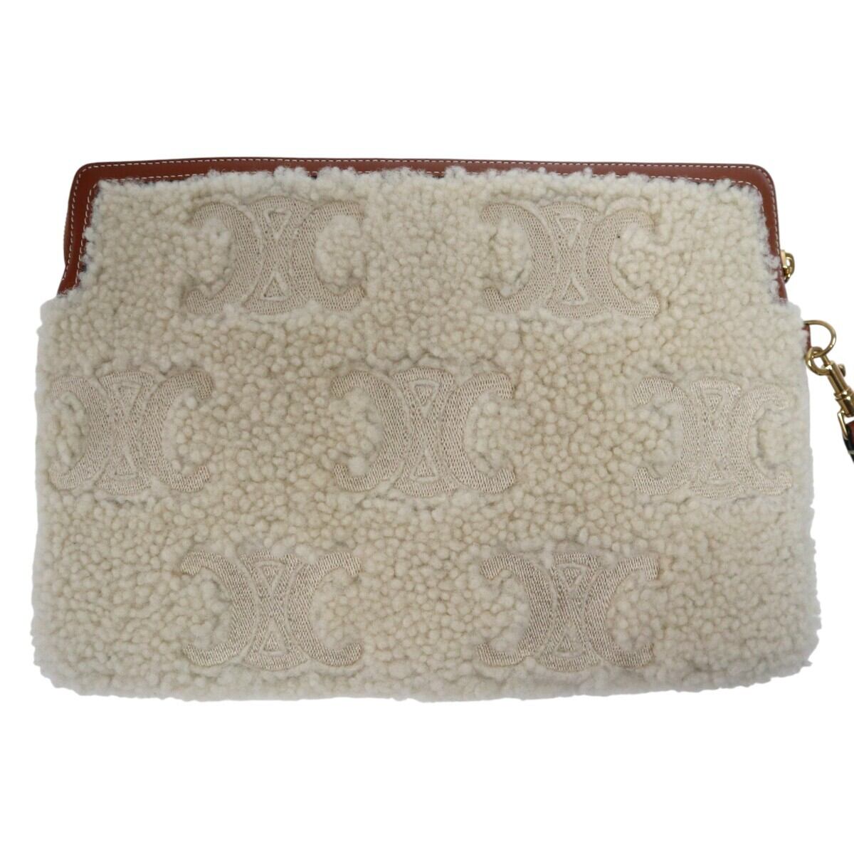 美品 CELINE セリーヌ トリオンフ ムートン/レザー ストラップ付き クラッチバッグ セカンドバッグ アイボリー/チャ M2512-k111