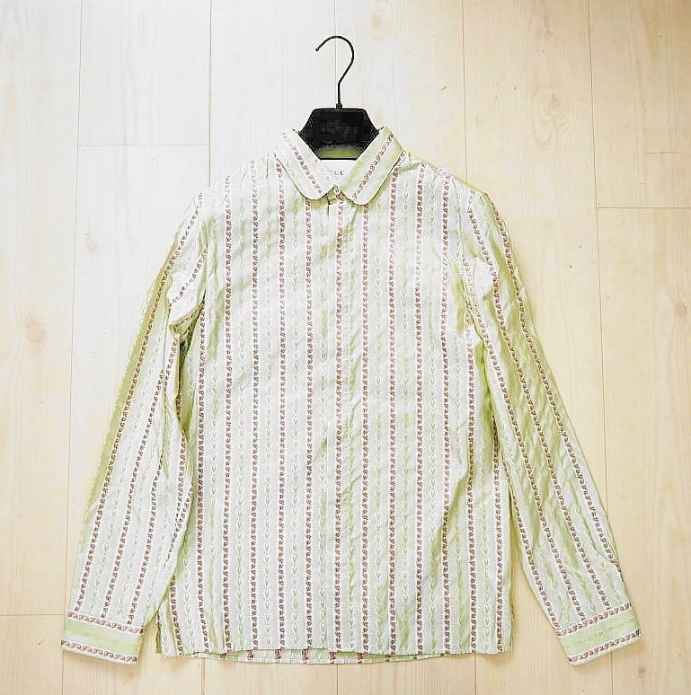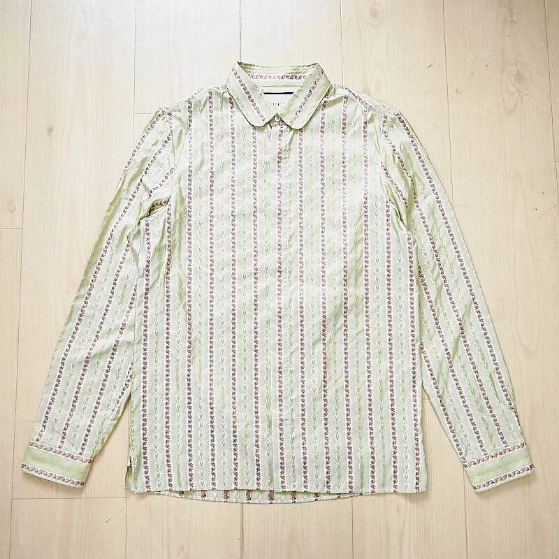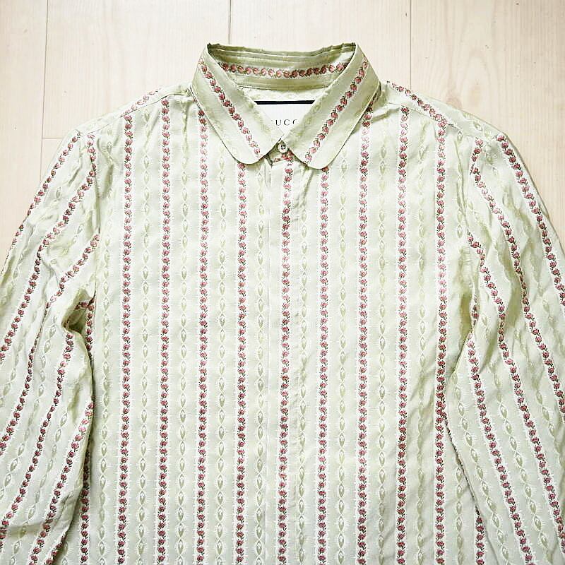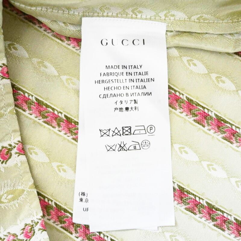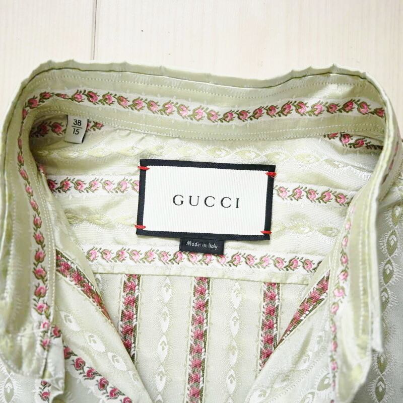 GUCCI グッチ フラワー刺繍総柄 シルク 長袖シャツ 38/15 カーキ T07-k164