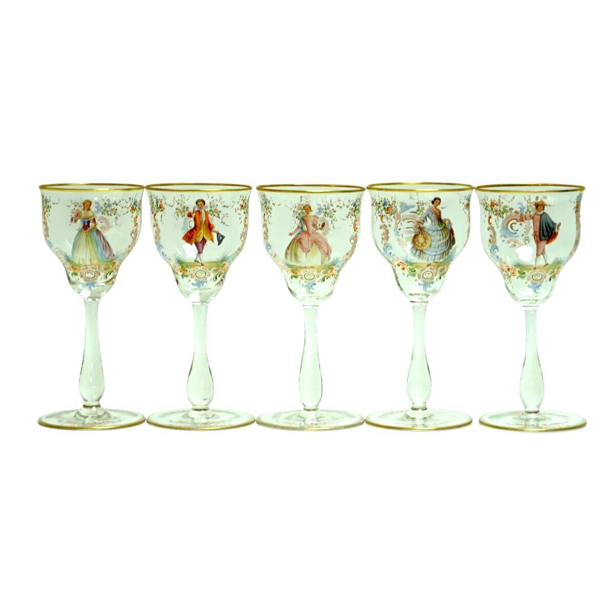 希少 LOBMEYR ロブマイヤー 中世貴人文ワイングラス 5客セット 金彩 エナメル彩 約20cm アンティーク T2602-t034