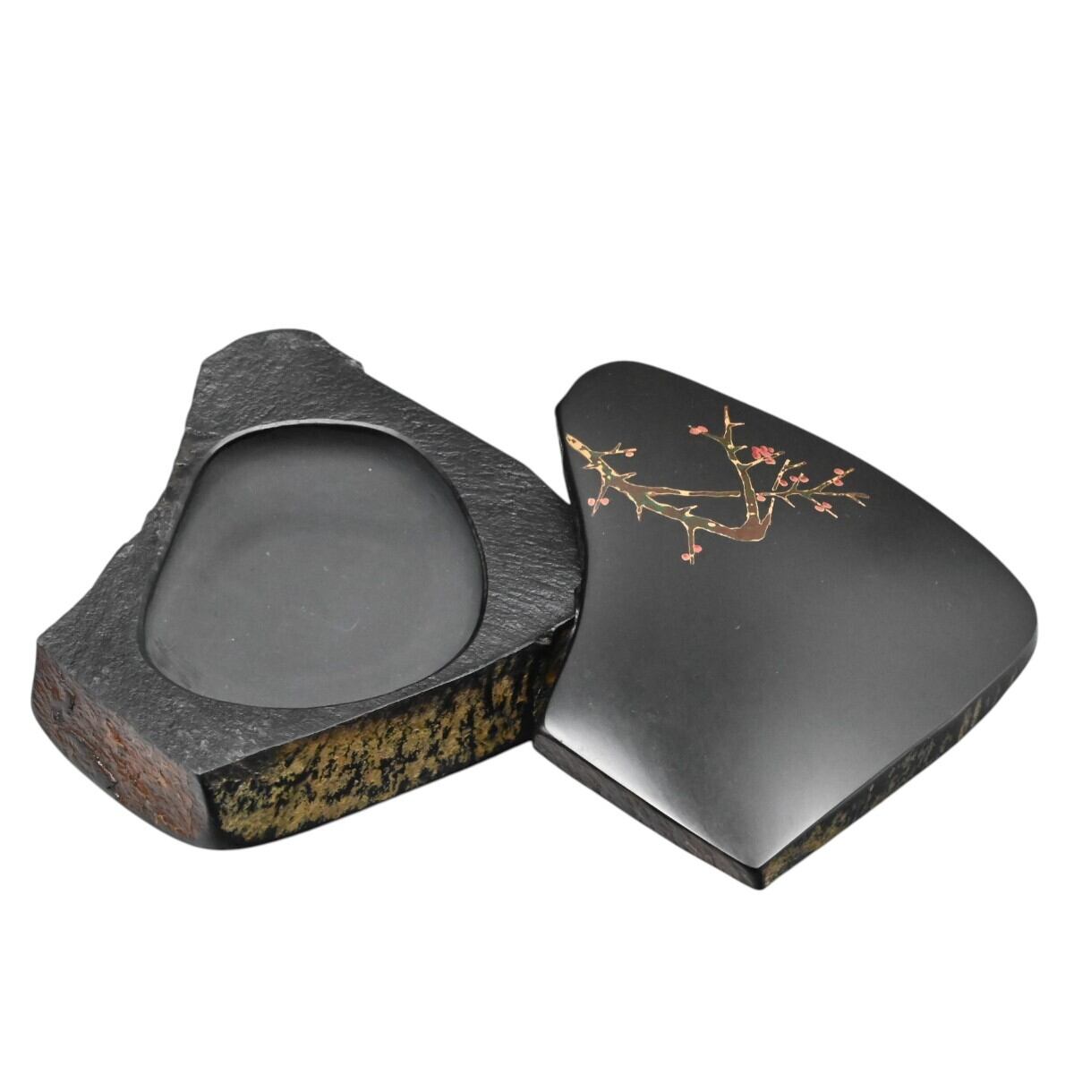鍋倉山龍渓硯 鍋倉漆象嵌 梅模様 清泉堂 三代目 深澤秀石作 天然硯 共蓋硯 M2602-s025