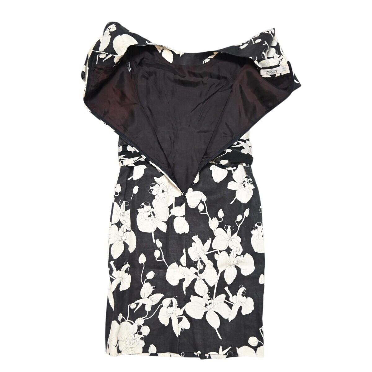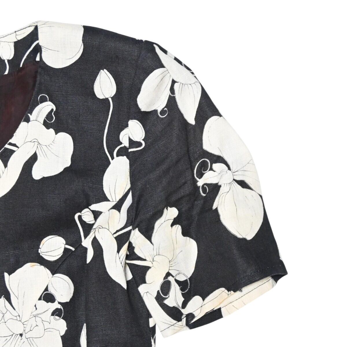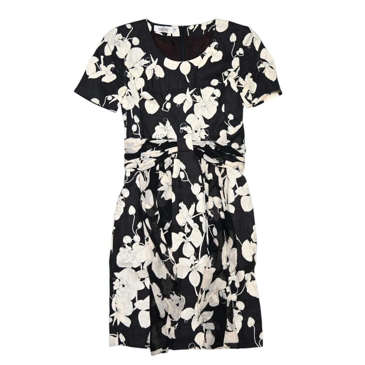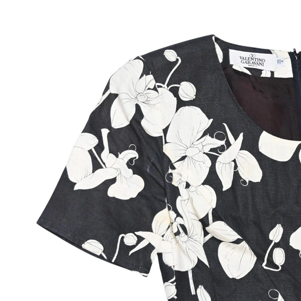 VALENTINO GARAVANI ヴァレンティノガラヴァーニ フラワー柄 リネン/シルク 半袖ワンピース 38/4 ブラック/ホワイト T2603-k041