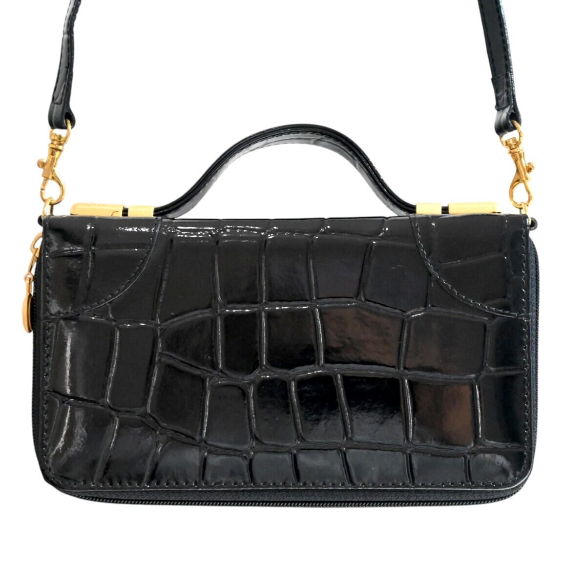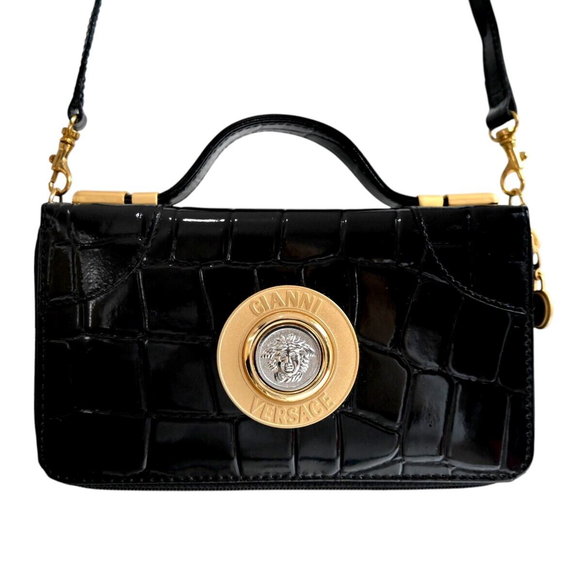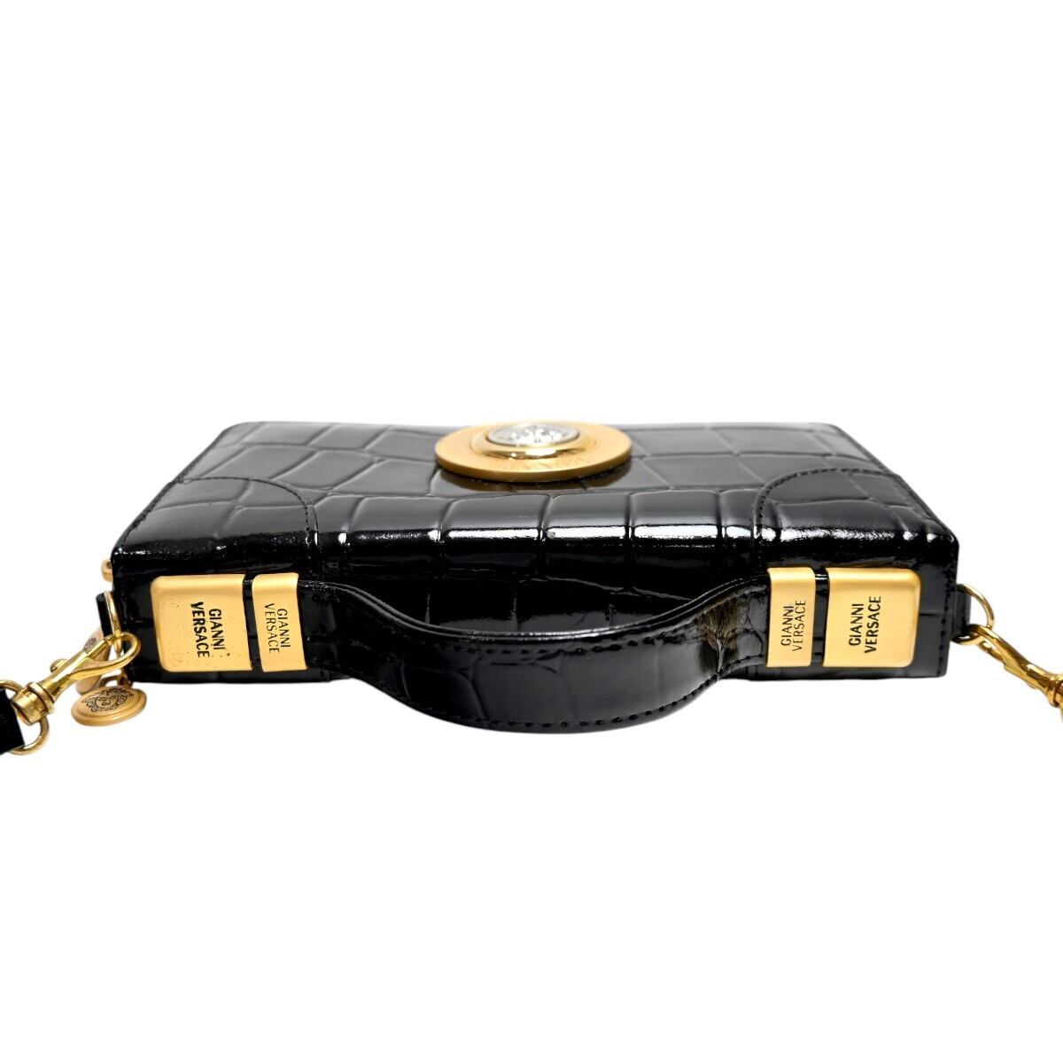 商品名:美品 GIANNI VERSACE ジャンニヴェルサーチ メデューサ クロコ型押しパテントレザー クラッチ ショルダーウォレット ブラック